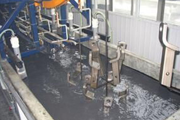 電泳涂漆是把工件和對應(yīng)電極放入水溶液樹脂制成電泳漆液中,接上直流電源后,在電場的作用下,涂料在工件上沉積形成均勻涂膜具有漆膜均勻,附著力強,質(zhì)量好,涂料利用率高,施工速度快優(yōu)點。根據(jù)工件的涂裝工藝要求和表面質(zhì)量要求以及產(chǎn)品批量的不同,可采用陽極電泳或陰極電泳工藝,其通過形式也分為通過式和間隙式,采用懸掛輸送機、程控自行葫蘆或電動葫蘆與前處理設(shè)備聯(lián)動,形成生產(chǎn)線。整套設(shè)備由主槽、附槽、罩體、漆液循環(huán)攪拌系統(tǒng)、通風(fēng)系統(tǒng)、溫度調(diào)節(jié)系統(tǒng)、超濾裝置、純水裝置、直流電源裝置、調(diào)漆裝置、泳后沖洗系統(tǒng)等組成,完成工件的底漆涂裝工作,具有操作方便、涂層質(zhì)量好的特點。